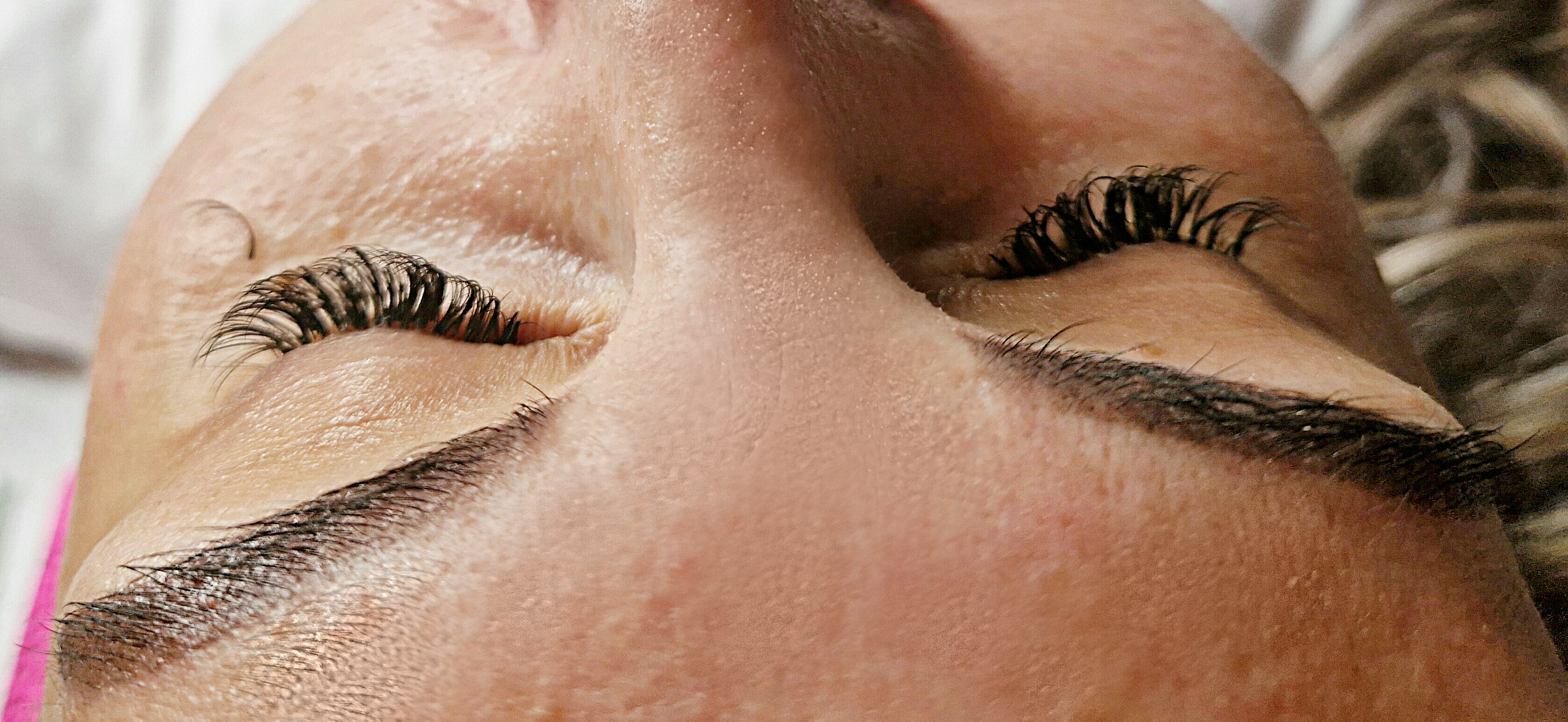 - Łzawienie i szczypanie oczu klientki podczas zabiegu – oko nie jest domknięte, płatek został umieszczony za głęboko i podrażnia błonę śluzową oka.
