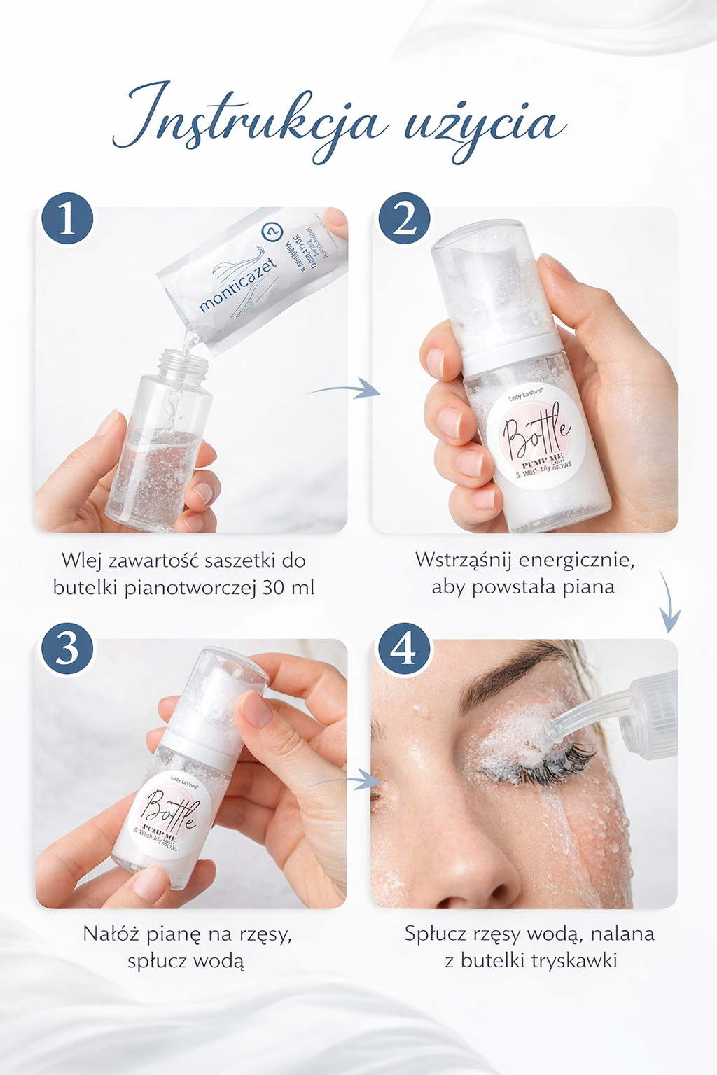 SPOSÓB UŻYCIA: Zawartość saszetki wlać do butelki pianotwórczej o objętości 30 ml, następnie uzupełnić (23 ml) wodą destylowaną. Niewielką ilość produktu nanieść na rzęsy naturalne. Delikatnie masować. Spłukać ciepłą wodą.